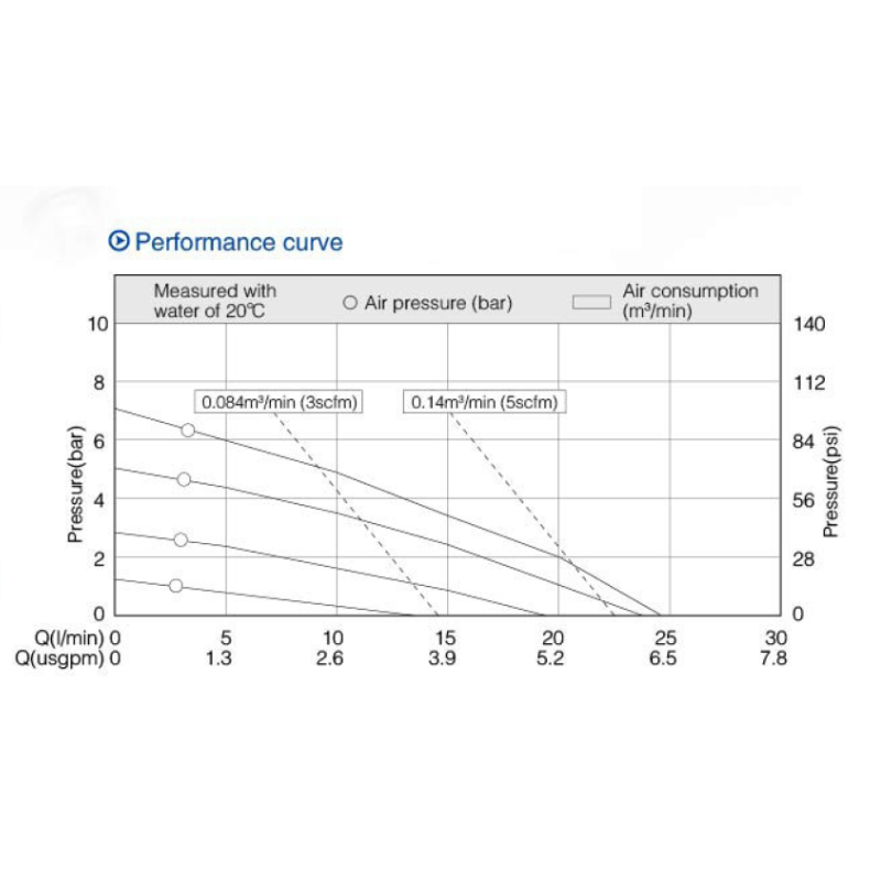 รุ่นนี้ให้อัตราการไหลสูงสุด 27 ลิตร/นาที และแรงส่งสูงสุด 70 เมตร โดยค่าจริงขึ้นกับชนิดของเหลว ความยาวท่อ และแรงดันลมที่ใช้