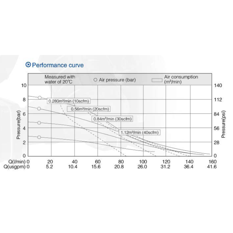 รุ่นนี้ให้อัตราการไหลสูงสุด 157 ลิตร/นาที และแรงส่งสูงสุด 84 เมตร โดยค่าจริงขึ้นกับชนิดของเหลว ความยาวท่อ และแรงดันลมที่ใช้
