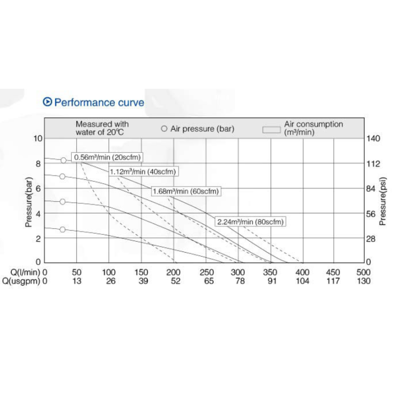 รุ่นนี้ให้อัตราการไหลสูงสุด 358 ลิตร/นาที และแรงส่งสูงสุด 84 เมตร โดยค่าจริงขึ้นกับชนิดของเหลว ความยาวท่อ และแรงดันลมที่ใช้