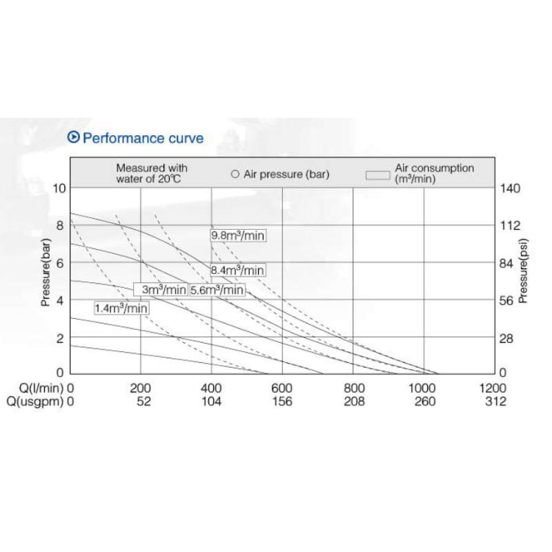 รุ่นนี้ให้อัตราการไหลสูงสุด 1,060 ลิตร/นาที และแรงส่งสูงสุด 84 เมตร โดยค่าจริงขึ้นกับชนิดของเหลว ความยาวท่อ และแรงดันลมที่ใช้